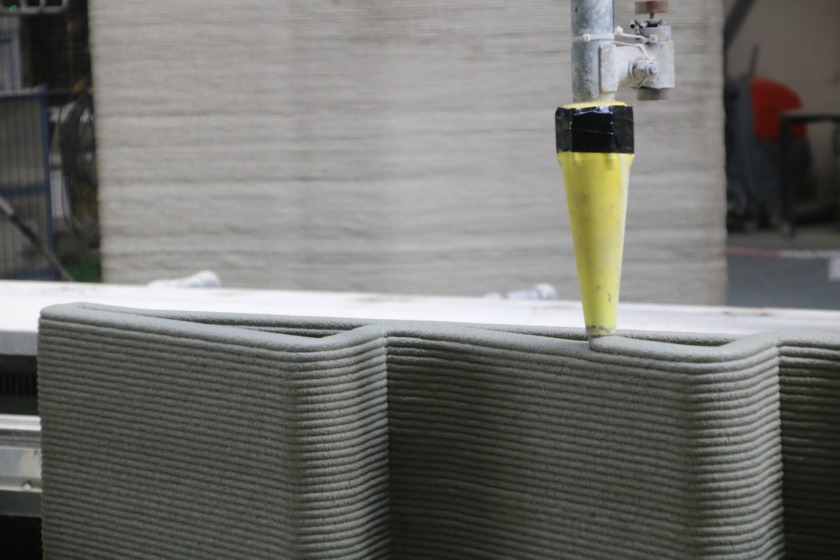 One of those strengths is the concrete printer's ability to place concrete only where it is constructively needed. Traditionally poured concrete is massive and contains much more concrete than is constructively needed. As a result, unnecessary concrete is used, which is bad for CO2 emissions because cement production releases a lot of this greenhouse gas.